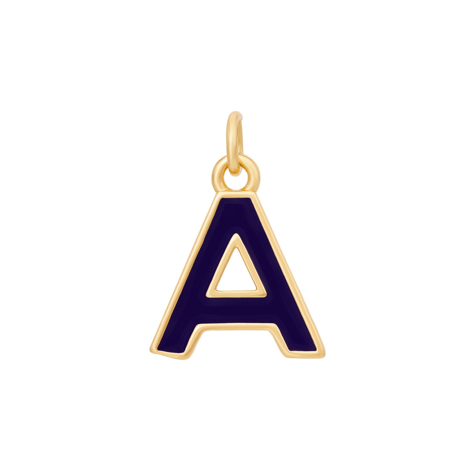 Dark purple enamel letter charms with gold plating, A through Z. Varsity style. 5/8" high, width varies by letter.