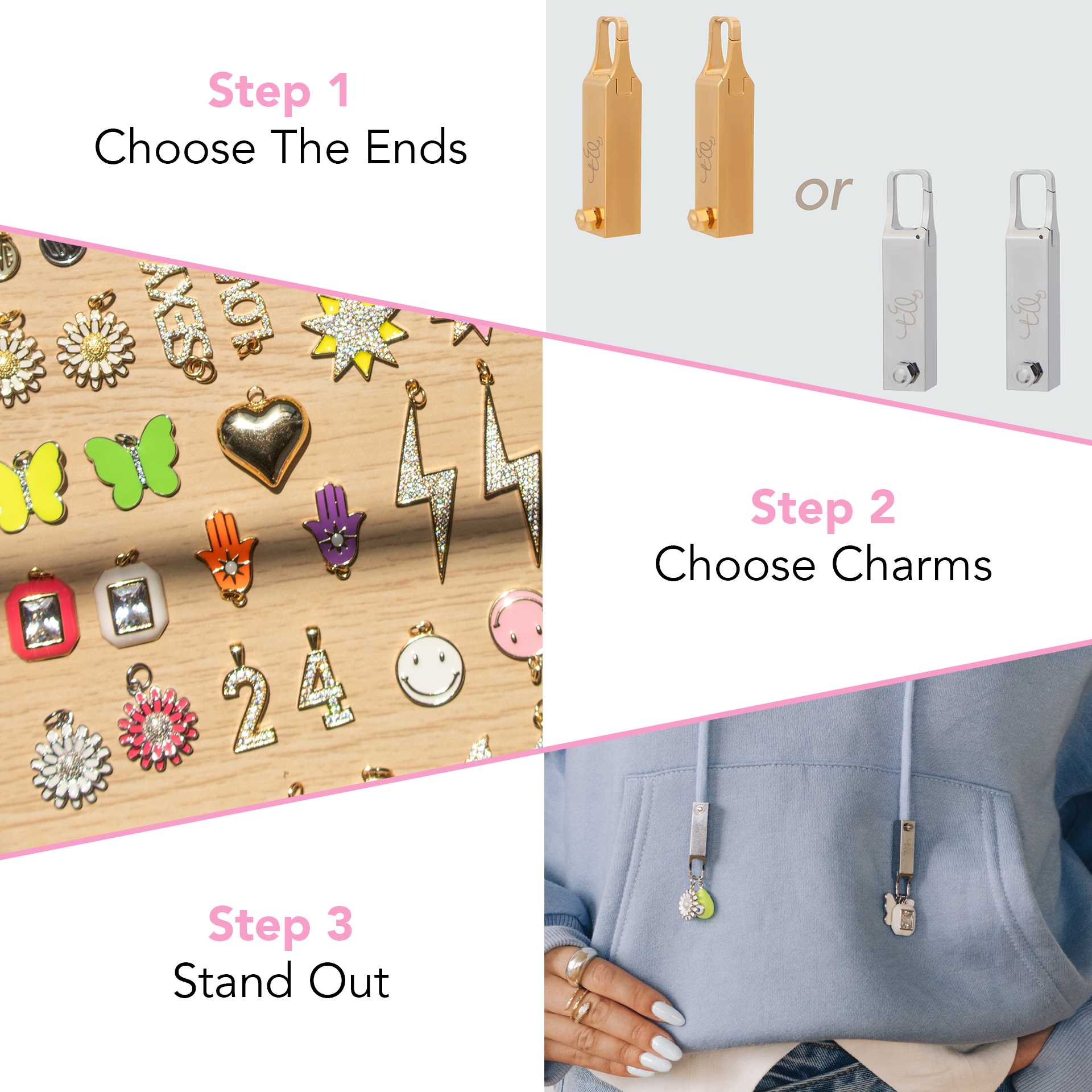 Introducing jewelry for your drawstrings. Put The Ends on hoodies, sweats, gym shorts, even sneakers. Then attach your choice of charms to make a personal style statement. Anything with a string can always use a little bling!