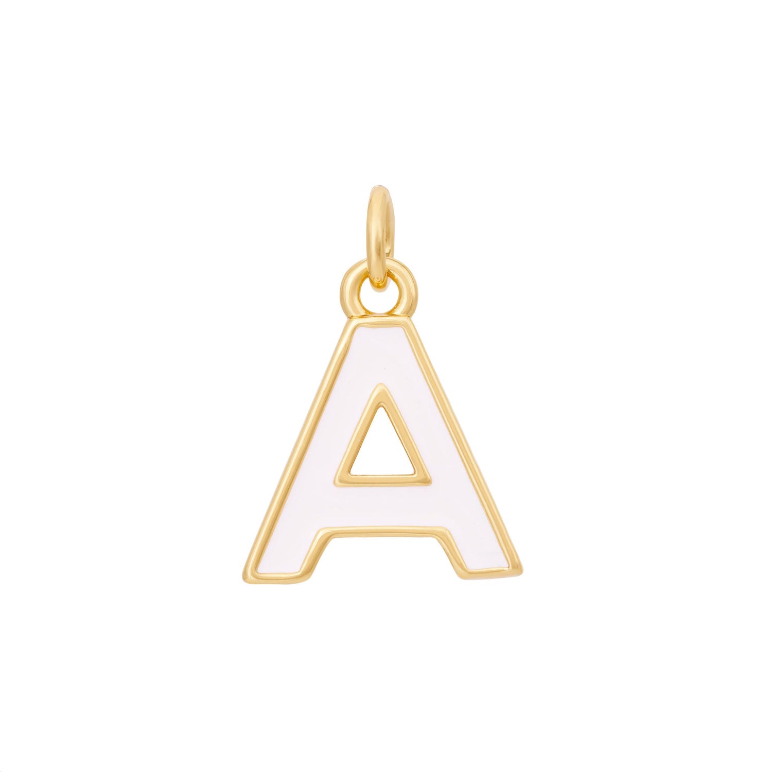 White enamel letter charms with gold plating, A through Z. Varsity style. 5/8" high, width varies by letter.